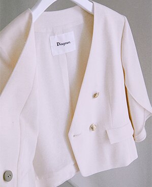 V開きのノーカラー、袖のスリットが女性らしい、ショートジャケット。パンツとニットをシンプルに合わせるだけで様になる。自然と華やかさを演出してくれる一品。