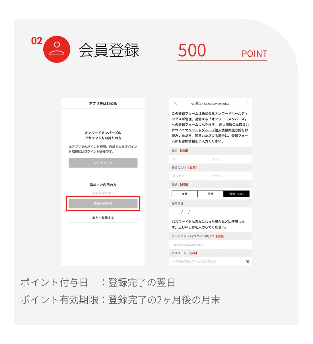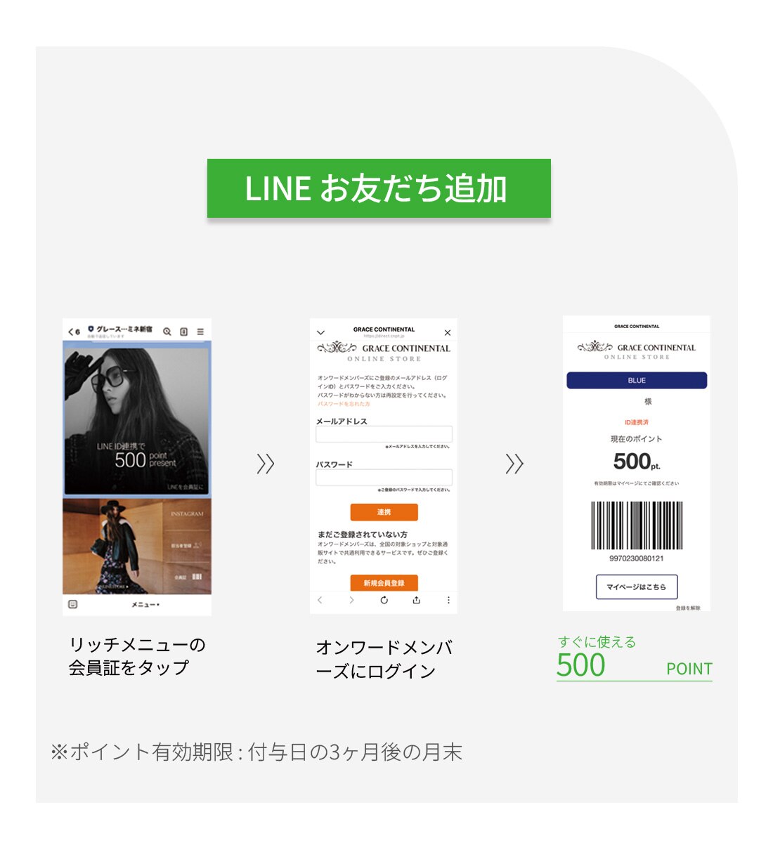 GRACE CONTINENTAL APP アプリダウンロードで、今すぐ使える¥4,000クーポンプレゼント 会員登録をすると、翌日から使える500ポイントをプレゼント 店舗にご来店いただくと100ポイントをプレゼント 商品バーコードで商品ページを検索できる、バーコード検索など機能充実 LINE お友だち追加・会員連携で今すぐ使える500ポイントをプレゼント