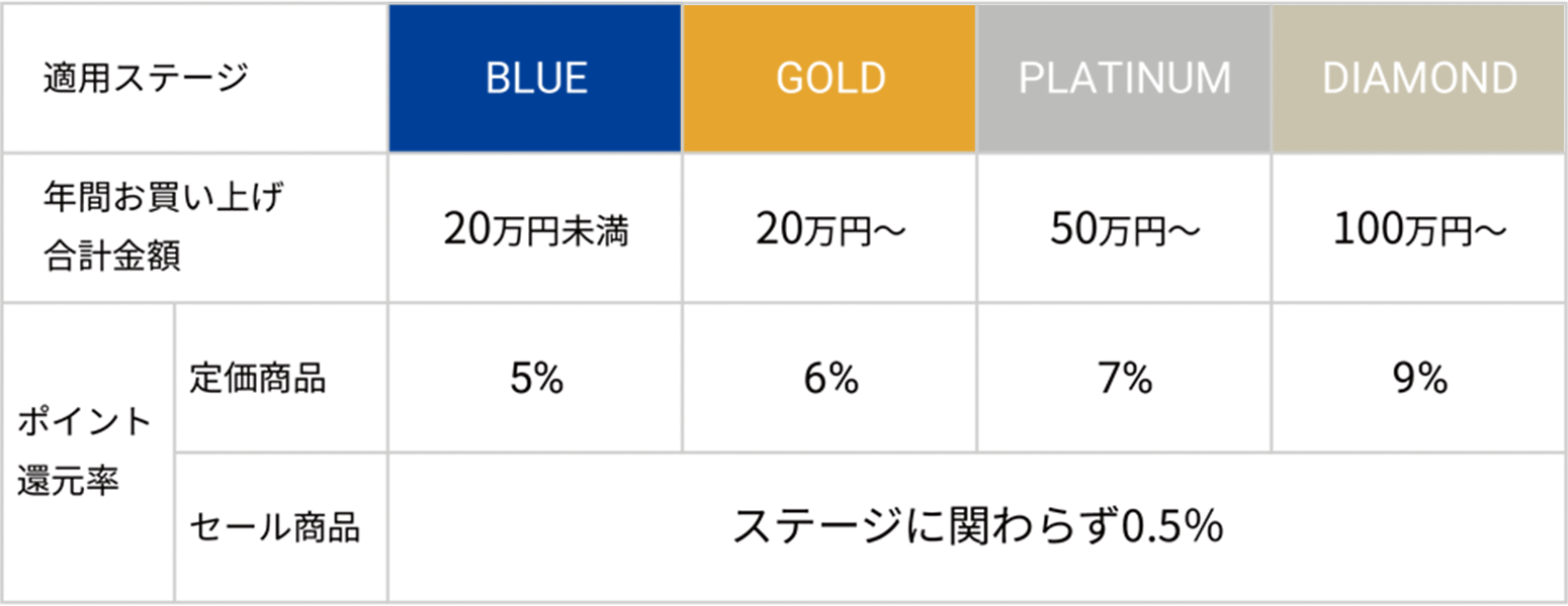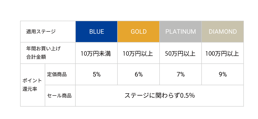 全国のオンワードメンバーズ対象ショップ・対象通販サイトでのポイント対象商品年間お買い上げ合計金額(税抜、前年3月1日〜当年2月末日)に応じて、毎年3月1日にステージが更新され、翌年2月末日までに適用されます。