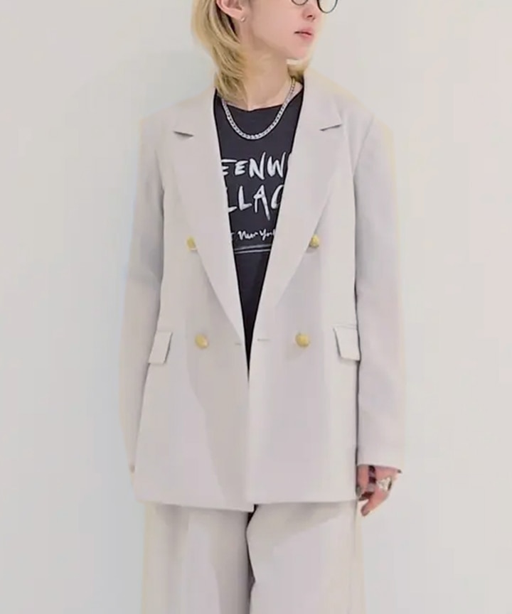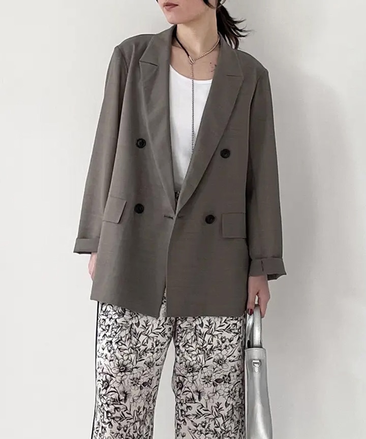 ドルマンスリーブのテーラードジャケット。オーバーサイズを意識しながら、肩傾斜や袖のバランスにこだわり、大きく見えすぎない女性らしさも残したサイジングに。浅めのダブル前やピークドラペルが、程よくマニッシュな雰囲気をプラスします。
