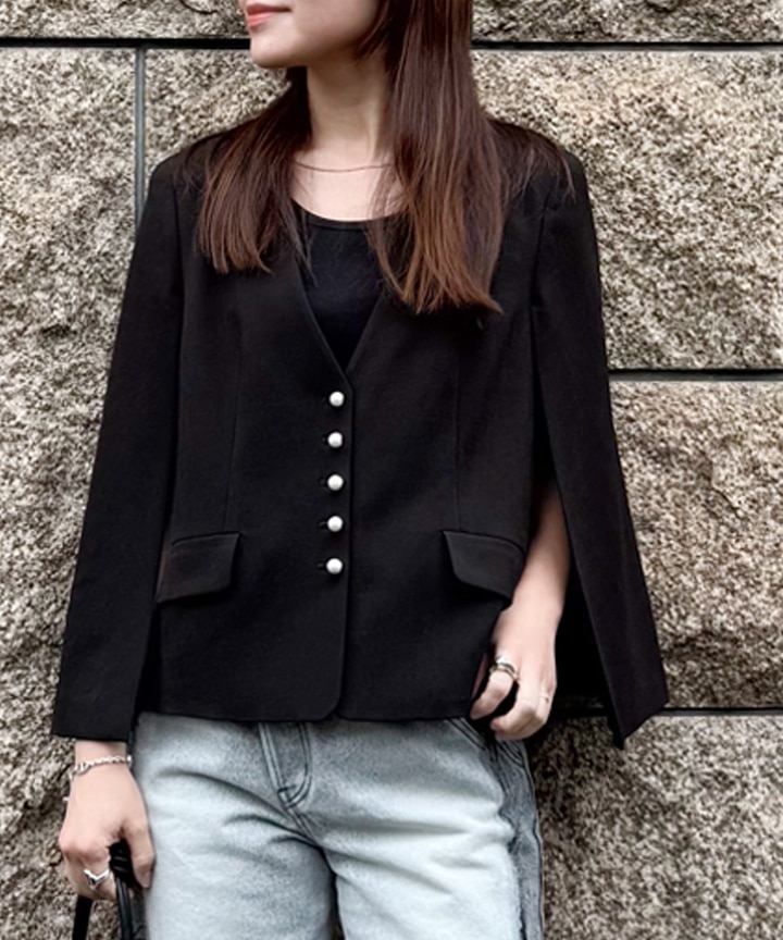 ブラックのジャケットを、グレーデニムで少しカジュアルに。見た目よりも軽やかで羽織りやすく、デイリーにも取り入れやすい一着です。フロントのパールボタンが引き立つよう、小物はブラックで揃えて全体をすっきりとまとめました。ゆとりのあるケープスリーブなので、肌寒い日は長袖をレイヤードしても楽しめそうです。
