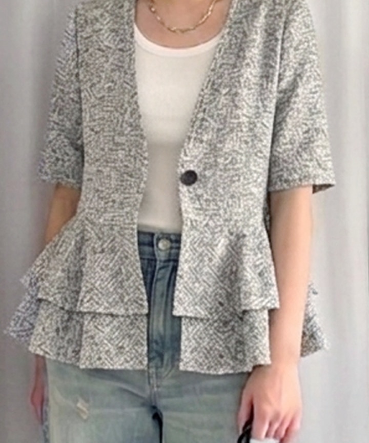 世界的にも名高い日本の毛織物産地・尾州で織り上げた無地調ツイード素材を使用した、女性らしいペプラムジャケット。ツイード特有のスラブ感を持ちながら、軽く柔らかな着心地で、暑い時期にもさらりと羽織れる一着です。