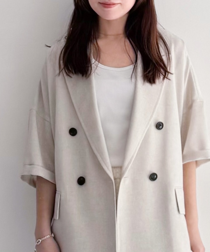 ドライなタッチと表情のあるストレッチスラブ素材を使用した、ピークドラペルのダブルジャケット。程よい肉感とストレッチ性を兼ね備えた日本製の麻調合繊素材で、清涼感と快適な着心地を両立しました。ナチュラルな風合いの中に、合繊特有の微光沢が上品さを添えてくれるのも魅力。 春先から着やすい総裏仕立てで、構築的な肩ラインやピークドラペルがマニッシュな印象を引き立てます。デイリーからきれいめなシーンまで幅広く活躍する一着です。