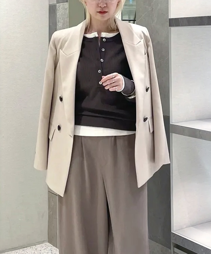 ベージュのジャケットに、2枚のカットソートップスをレイヤード。旬なバレルパンツを合わせて、モードなニュアンスをプラスしました。アースカラーでまとめながらも、ジャケットが全体を洗練された印象に引き上げてくれます。ストレッチ性のあるジャケットは、デイリーにレイヤードスタイルを楽しむのにもおすすめです。