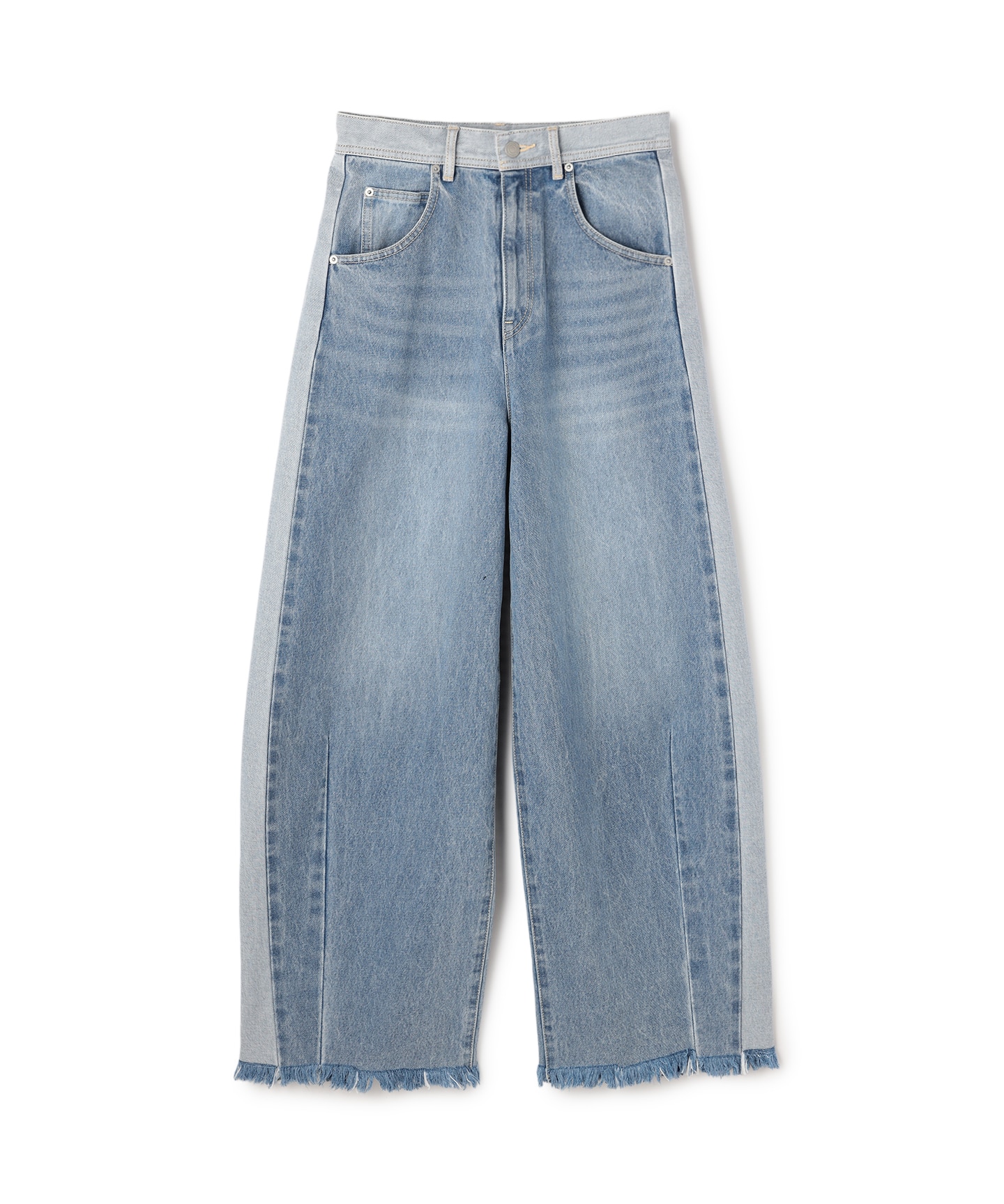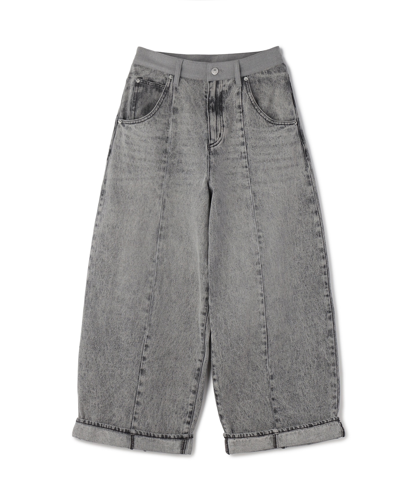 デニムは加工を施した後に接ぎ合わせることで、奥行きのある風合いを表現。ウエスト後ろはゴム仕様、フロントにはドロストディテールを取り入れ、見た目のモード感とリラックスした履き心地を両立しました。