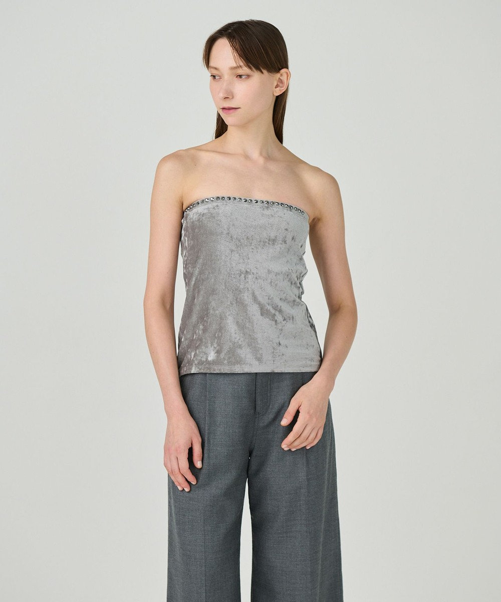 シアー感のあるベロアにレーヨンのストレッチ素材を内側にして、2重仕立てにしたベアトップス。